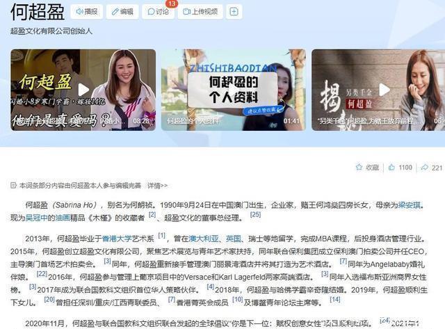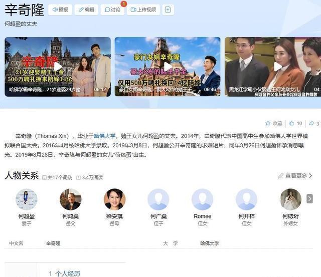 参考信息:生活报——2016年5月15日——哈三中学生被哈佛录取3年读200多本英文原著 中国新闻网——2013年3月10日——赌王千金何超盈闹市失魂游荡疑似吸毒致幻(图) 中国日报网——2019年3月13日——未来女婿是哈佛学霸?赌王四太:相信女儿眼光 齐鲁晚报——2021年1月12日——相比其他富二代,“赌王之女”何超盈让人刮目相看 百度百科——何超盈、辛奇隆