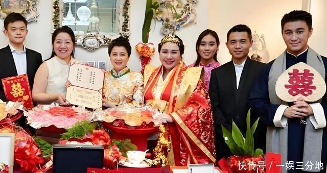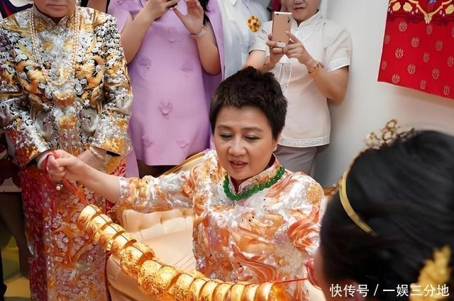 6月7日中式过大礼,辛奇隆送500万聘礼加金银珠宝,何家回14亿嫁妆:5亿别墅、8亿豪宅、1亿珠宝。 现场金光闪闪,何超盈穿红礼服,辛奇隆腼腆却坚定。 8月28日女儿“荷包蛋”辛千觅出生,重8磅。